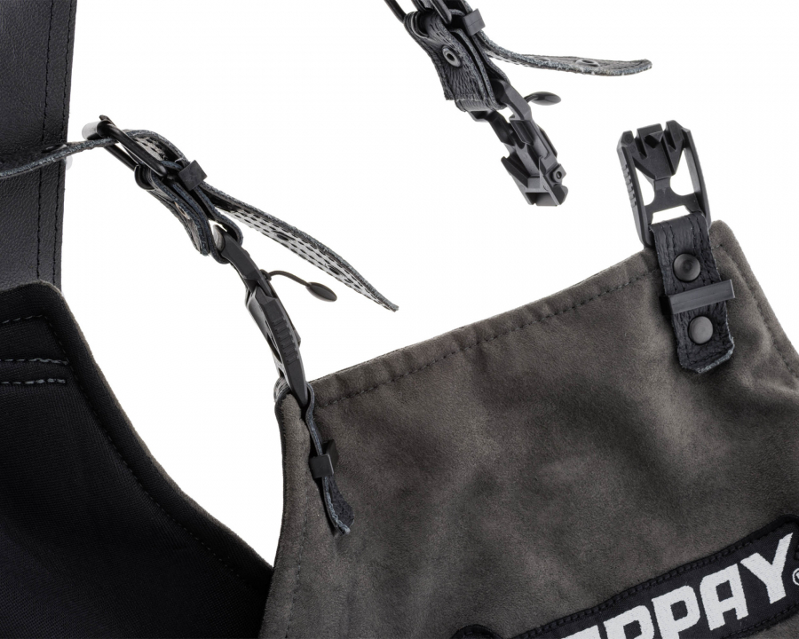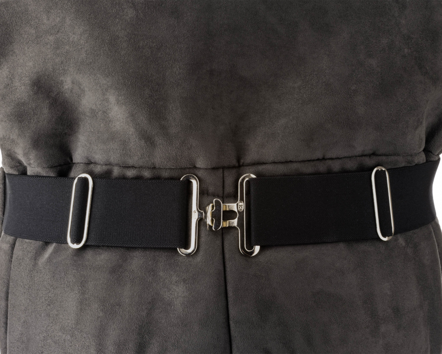 Predný diel je možné stiahnuť gumovým pásikom so sponou, zadný diel je možné stiahnuť koženým pásikom s prackou.